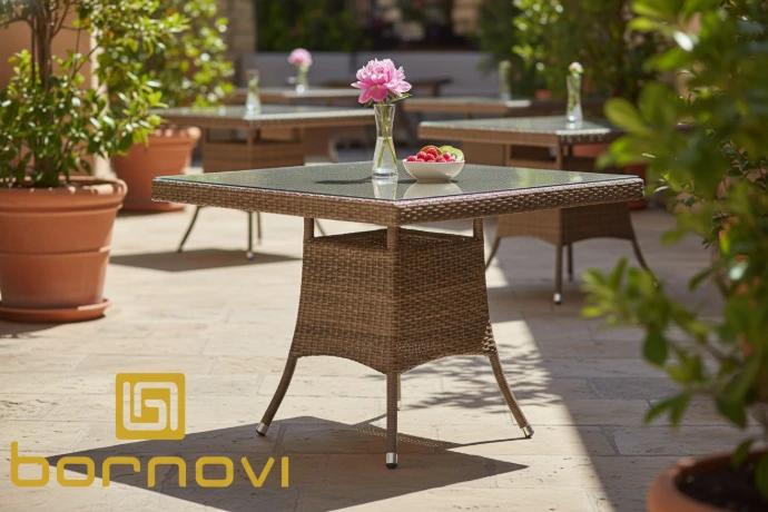 این میز زیبا و مقاوم، بهترین انتخاب برای فضای باز باغ و رستوران شماست. بدنه‌ی سبک و مستحکم این محصول از آلومینیوم ساخته شده که مقاومت بالایی در برابر زنگ‌زدگی و خوردگی دارد و به راحتی در برابر شرایط جوی مختلف دوام می‌آورد.بورنوی این میز را با بیشتر برای صندلی ها بار که بافت آن ها تمام بافت می باشد ست می کند